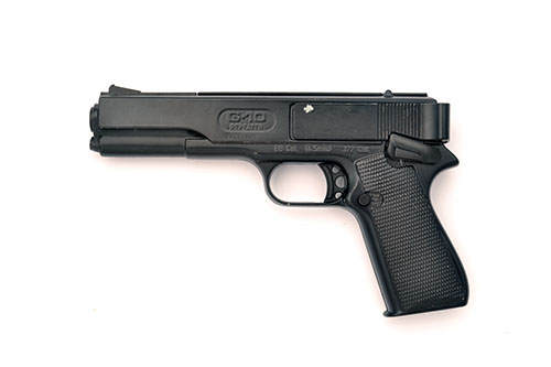A .177 SLIDE-COCKING REPEATING AIR-PISTOL SIGNED HUNTINGDON BEACH, MODEL 'G10', serial no. 98086081, circa 1998, with 2 1/2in. flip up barrel repeating on bb's, black painted receiver and frame, chequered integral grip, loosely following the lines of a Colt 1911