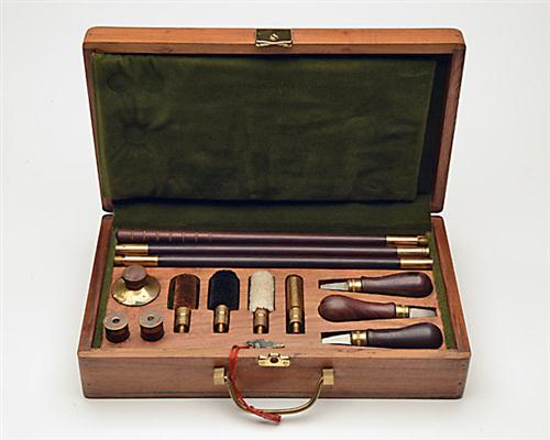 A 'WILLIAM POWELL 12-BORE 'DELUXE' CLEANING KIT, fitted partitioned tray with separate compartments containing three turnscrews, three-piece cleaning rod, heads, oil bottle (SIGNED 'William Powell' and snap-caps (SIGNED 'William Powell), case lined with green baize, brass lock (including key), brass fittings