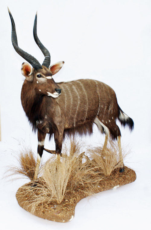 A FINE FULL-MOUNT OF A NYALA, with horns approx. 26in. in length, circumference approx. 61/2in., mounted on plinth with savannah grass