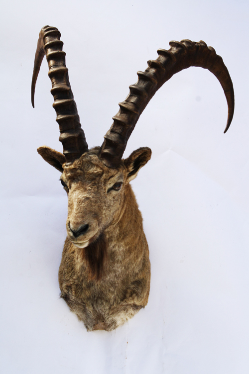 A CAPE & HEAD MOUNT OF AN IBEX, with horns approx. 36in., circumference approx. 9 1/4in., shot Mongolia