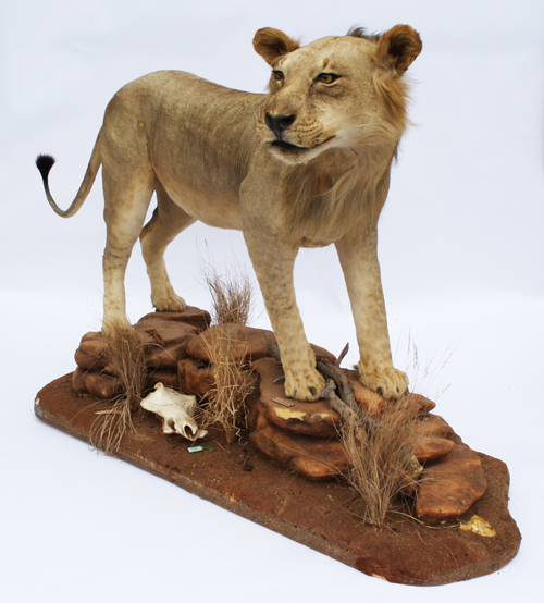 skull measuring approx. 16in. in length, approx 32in. round, mounted on plinth with savannah grass
