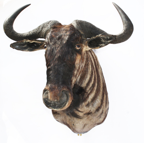 A CAPE & HEAD MOUNT OF A BLUE WILDEBEEST, with outside spread approx. 26in., inside spread approx. 22in., tip-tip approx. 17in., boss approx. 4 1/4in., shot in Alwal North Africa 2001