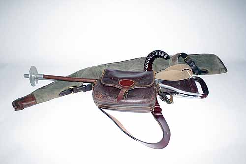 A HOLLAND & HOLLAND CANVAS AND LEATHER GUNSLIP; Together with a leather cartridge bag, an alloy and leather shooting stick and a leather cartridge belt (4)