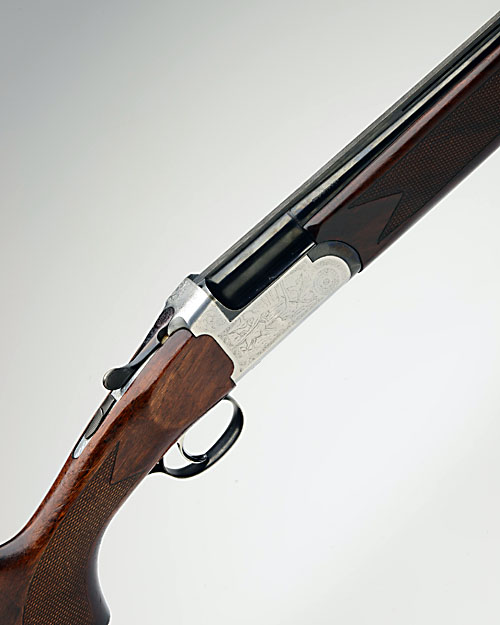 MAROCCHI 20-BORE SINGLE-TRIGGER OVER AND UNDER EJECTOR, serial no. 98110, 27 1/4in. nitro barrels with ventilated mid-rib and 6mm ventilated matt top-rib, 2 3/4in. chambers, bored approx. true cyl. and 1/4 choke, hold-open toplever, manual safety, engraved with scenes of hound and fowl, silver finish, 14in. pistolgrip stock (fore-end wood split)