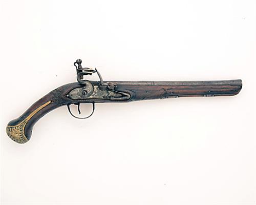 A 22-BORE FLINTLOCK HOLSTER-PISTOL, UNSIGNED, no visible serial number, circa 1780 for the Turkish market, with swamped 10 1/4in. barrel, the octagonal breech with false signature and date,radiused lock with pointed tail and false signature, carved walnut full-stock, carved brass butt-cap with long ears, engraved iron furniture and false ramrod
