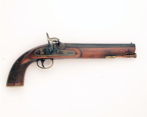 A 17-BORE PERCUSSION HOLSTER-PISTOL, UNSIGNED, no visible serial number, probably produced for the colonies, with blued 9in. tapering barrel, Birmingham proofs, plain colour-hardened lock (much finis remaining), walnut full-stock with chequered pistol-grip butt (cracked through and repaired), brass furniture and replacement ramrod