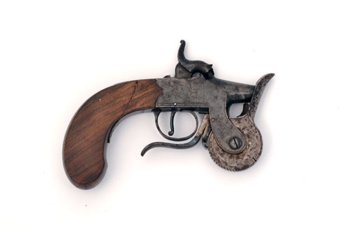 circa 1840, with 1in. 'barrel', graduated iron 'snail' operating on a spring-loaded ratchet to the fore with release lever behind, squared border and scroll engraved central hammer boxlock action signed in a banner on the left hand side 'LABBON', walnut slab-sided butt (cracked and repaired at head) and iron scroll engraved trigger-guard bow, strong traces of original finish
