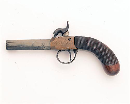 A 54-BORE PERCUSSION POCKET-PISTOL WITH BRASS FRAME, UNSIGNED, no visible serial number,