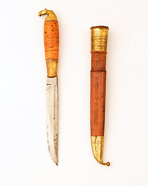 A NORDIC FISHING KNIFE, made in Finland and signed 'YISAKKI YARVENPAA OY', with wood hilt and horses-head gilded pommel, with its embossed leather scabbard with gilded mounts, 5 1/2in. blade, some staining