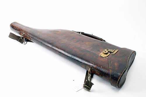 A LEATHER LEG-OF-MUTTON SINGLE GUNCASE, fitted for 30in. barrels, brass lock (key missing)
