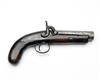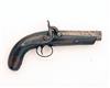 AN 18-BORE PERCUSSION TRAVELLING PISTOL , UNSIGNED, no visible serial number, circa 1855, with octagonal 4 1/2in. barrel, back-action lock with borderline engraving, walnut full stock with bag-shaped butt, missing ramrod and other small losses and discolouration
