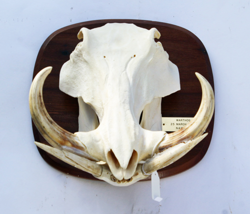 A FINE SKULL MOUNT OF A WARTHOG, mounted o a wooden plaque