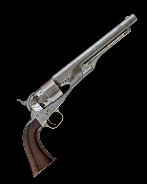 for 1867, with 8in. barrel signed 'ADDRESS COL SAML COLT NEW-YORK US AMERICA', hinged under-barrel rammer (traces of plating), stepped cylinder (roll-engraved scene removed), plain iron open frame, plated brass trigger-guard and front-strap, iron back-strap, smooth walnut one-piece grip, no provision for shoulder-stock and stripped of finish