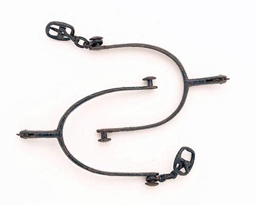 A PAIR OF IRON MILITARY SPURS, circa World War One, retaining strap buckles but missing leather straps, some corrosion