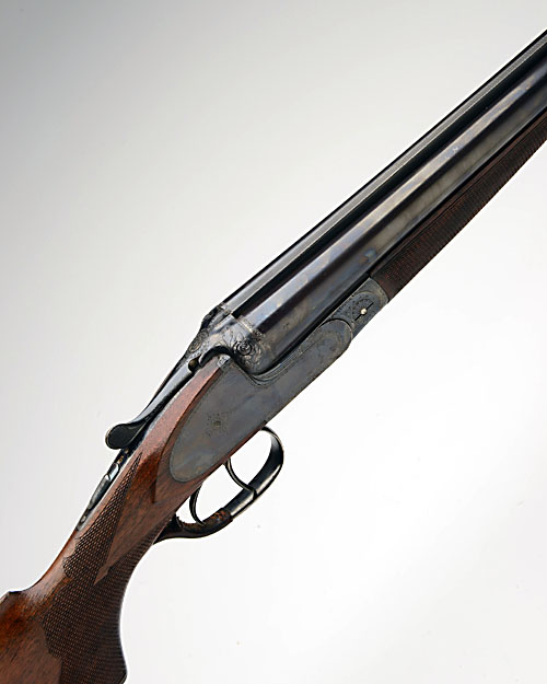 A BELGIAN 16-BORE SIDEPLATED BOXLOCK EJECTOR, serial no. 44220, 26 3/4in. (68cm) nitro barrels with raised matt rib, 2 1/2in. chambers, bored approx. 3/4 choke in both, left tube stamped 'F. DUMOULIN ET CIE. LIEGE', treble-grip action with side-clips and carved floral fences, automatic safety, border engraving, blued finish, 14 1/2in. pistolgrip stock with cheekpiece, pistolgrip-cap and including 1in. rubber recoil pad