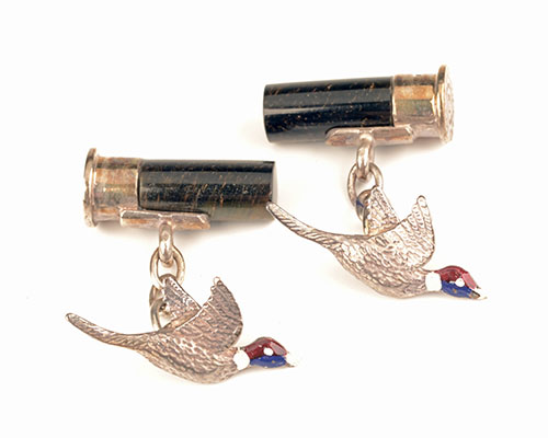 London sterling silver hallmarks, maker H&H, silver and tiger's eye 'cartridges' with Holland & Holland headstamps, silver link chain, silver pheasants with polychromatic enamelled heads