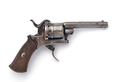 A 7mm PINFIRE DOUBLE-ACTION POCKET-REVOLVER, UNSIGNED, no visible serial number, Belgian circa 1855, with octagonal 3 1/4in. barrel, plain cylinder, open frame, chequered wood grips and folding trigger, missing ejector