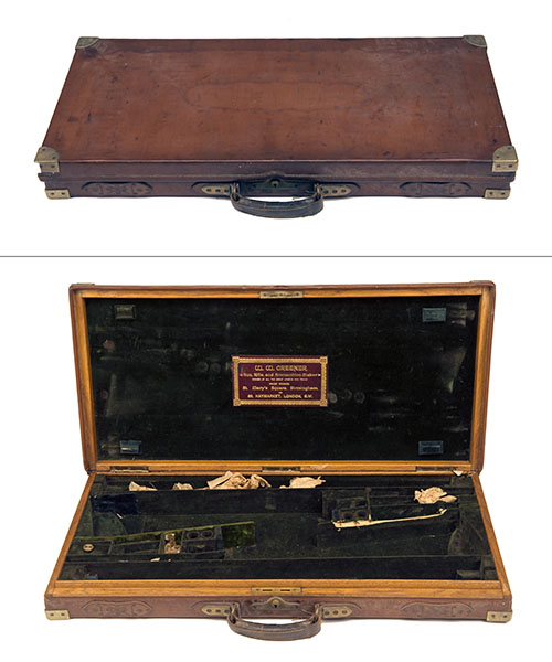 fitted for 27in. barrels (could be adapted to 28in.) the interior lined with green velvet, central brass push-button lock (key missing), the lid interior with a gold tooled red leather 'W.W. GREENER, ST. MARY SQUARE, BIRMINGHAM AND 68, HAYMARKET, LONDON, S.W.' trade label, straps missing