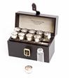 ten numbered 925 sterling silver and glass 12-bore cartridge shaped shot glasses signed 'PURDEY', fitted in a handmade suede-lined leather case