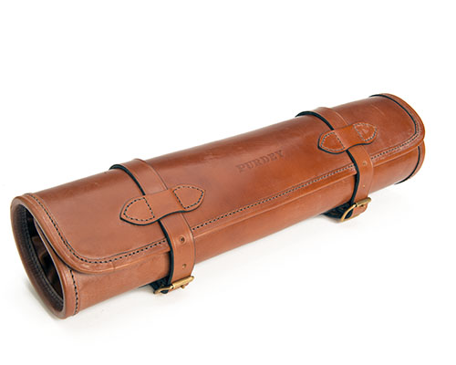 † JAMES PURDEY & SONS LTD. A NEW AND UNUSED HAND-MADE BRINDLE LEATHER SUEDE-LINED CLEANING ROLL,