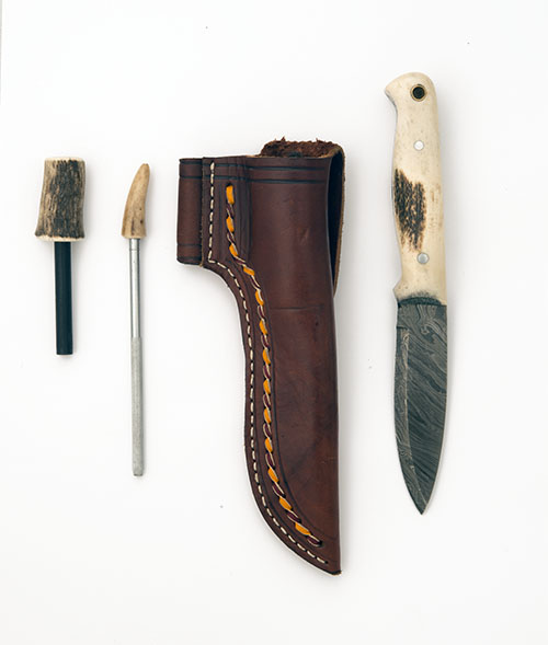 finely polished damascus full-tang damascus steel blade, polished antler handle with loop-hole, fire-steel sharpening tool, tanned moulded leather sheath