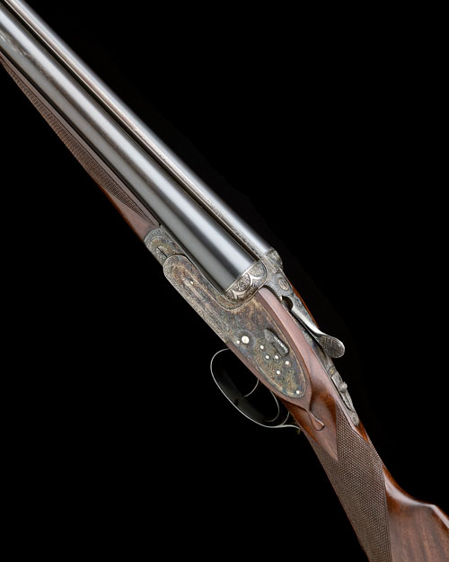 26in. nitro chopperlump barrels, 2 3/4in. chambers, bored approx. 1/4 choke in both, engraved arcaded fences, removable striker discs, automatic safety, hand-detachable lockplates, gold-inlaid cocking-indicators, articulated front trigger, rolled-edge triggerguard, fully scroll engraved, retaining much original colour-hardening and finish, 14 5/8in. stock, weight 6lb. 7lb.