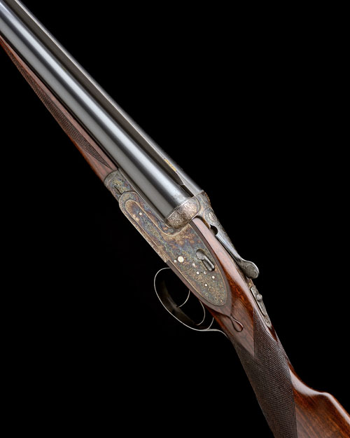 25in. nitro barrels with Churchill-rib, 2 3/4in. chambers, bored approx. true cyl. and 1/4 choke, removable striker discs, automatic safety with gold-inlaid 'S' detail, hand-detachable sidelocks, gold-inlaid cocking-indicators, rolled-edge triggerguard, articulated front trigger, floral scroll engraving, retaining virtually full original colour-hardening and finish, 15 1/2in. stock including 1in. extension, weight 6lb. 11oz.
