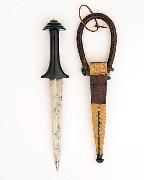 A GOOD NUBIAN ARM-DAGGER, late 19th century from the Sudan, with 7 1/4in. tapering double-edged blade, twin shallow wide fullers and central ridge to both sides, typical cylindrical dark wood hilt swelling to form guard and with turned, stepped circular pommel, complete with its embossed leather and reptile skin mounted scabbard with leather rope arm-band