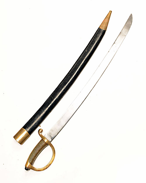 A CONTINENTAL BRIQUET SIDEARM, almost certainly French and first quarter of the 19th century, with slightly curving single-edged 23in. blade (cleaned), brass hilt with 'D' shaped knuckle-bow and ribbed grip, complete with its original black leather brass mounted scabbard
