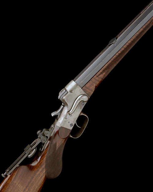 circa 1881, with heavy two-stage 28in. blued barrel signed 'REMINGTON ARMS CO. ILION N.Y.' and marked with the calibre, dove-tailed tunnel fore-sight, blanking plate to the rear-sight dove-tail, colour-hardened plain receiver (faded) marked 'HEPBURNS PAT OCTOBER 7th 1879', central hammer, top-tang mounted with vernier peep-sight, walnut chequered half pistol-grip butt-stock with raised cheek-piece, nickel-plated crescent iron heel-plate, colour-hardened grip-cap and under-lever, chequered walnut splinter fore-end with plated tip
