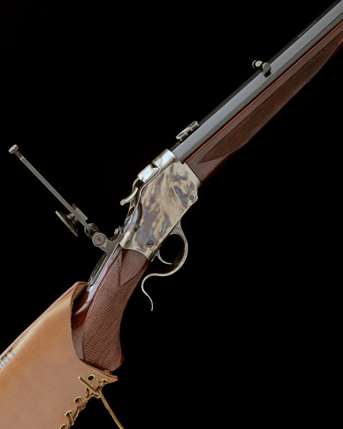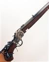 A UBERTI, ITALY .40-65 (WCF) SINGLE-SHOT MATCH-RIFLE, MODEL 'WINCHESTER 1885 HIGH-WALL', serial no. S02859, with heavy octagonal 30in. blued barrel, dove-tailed tunnel fore-sight, spirit level mounted forwards of the breech, provision for telescope mounting blocks (one present), colour-hardened plain receiver, central hammer, top-tang mounted with vernier peep-sight, walnut chequered pistol-grip butt-stock, crescent iron heel-plate, colour-hardened under-lever, chequered walnut splinter fore-end with moulded tip, the whole appearing little used; COMPLETE WITH a leather padded lace-on cheek-piece