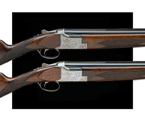 27 1/2in. nitro barrels with 6mm ventilated matt top-ribs, gold-inlaid at the breech ends 'I' and 'II', 2 3/4in. chambers, bored approx. 1/4 and 1/2 choke, hold-open toplevers gold-inlaid 'I' and 'II', manual safeties with integral barrel selector switches, beaded border and scroll engraving surrounding game scenes of pheasant, partridge and capercaillie, gun No.1 signed 'D. Ciancaleoni', No.2 signed 'R. Coenen', bright finish overall, 14 3/8in. figured roachbelly stocks including original FN buttplates, weight 6lb. 13oz.
