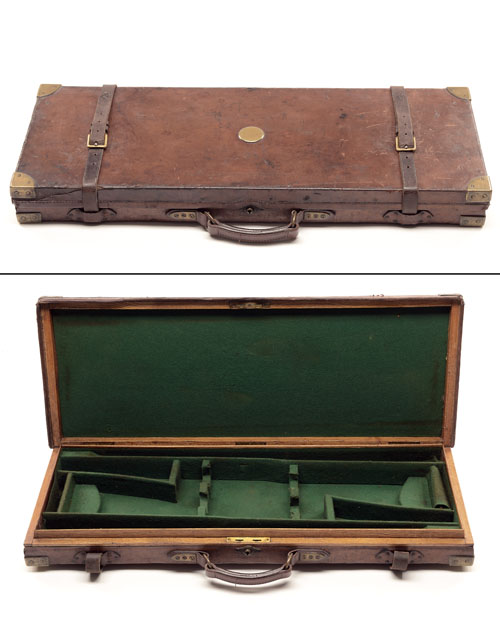 fitted for 27in. barrels (could adapt up to 31in.), the interior lined with green baize, central brass push-button lock (key missing), the lid exterior with a brass escutcheon