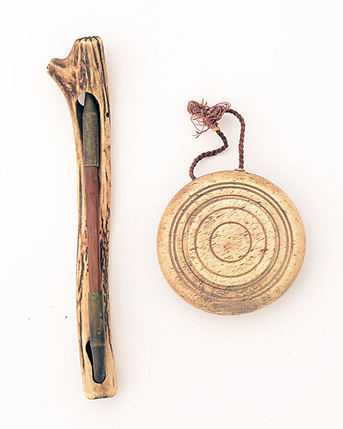 AN ORIENTAL OPIUM PIPE, ANTLER HOLDER AND BONE STORAGE POT, probably Chinese and circa 1880, the pipe of brass-mounted natural reed and of typical form with small pan and mouthpiece, together with a natural antler holder with carved ends and drilled for suspension, the turned bone pot approximately 3 1/2in. in diameter with separate lid and cord suspender