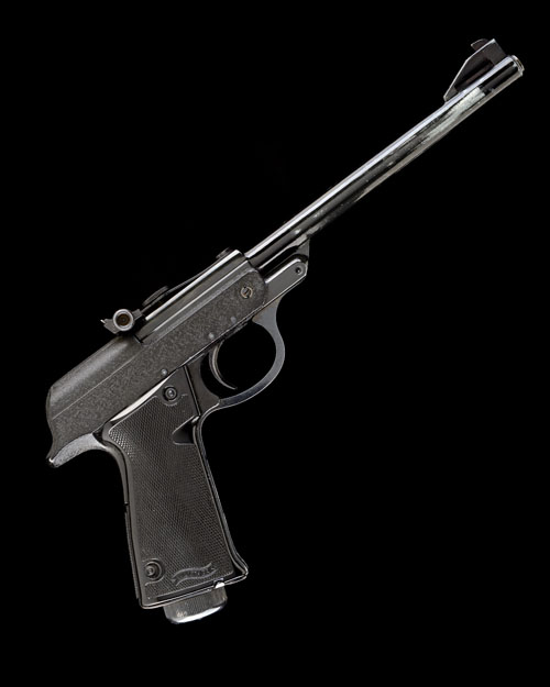 circa 1965, with anodised 9 1/2in. barrel, black crackle-finished receiver and brown chequered plastic grips, remaining in good condition with much original finish; TOGETHER WITH its makers brown card carton and wood cocking aid (box scuffed and corners gone)