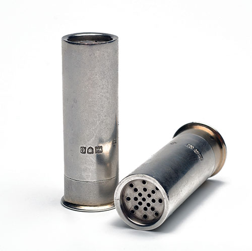 A PAIR OF STERLING SILVER CELERY-SALT SHAKERS IN THE FORM OF 12-BORE CARTRIDGES,