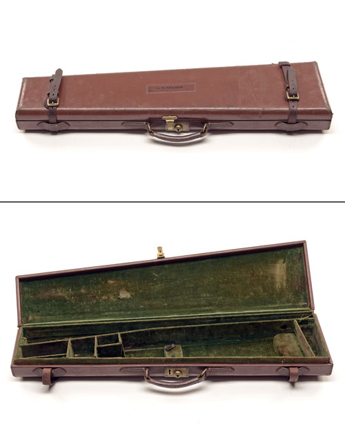 fitted for 28in. barrels, the interior lined with emerald green, lock missing key, the lid exterior with 'G.B. NELSON'
