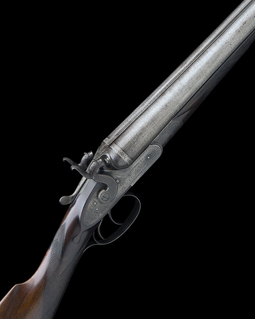 30in. fine damascus barrels carved at the breech ends, rib engraved in gothic script 'JOHN RIGBY & CO. DUBLIN & LONDON', 2 1/2in. chambers, bored approx. 1/4 and 1/2 choke, some dents and internal pitting, carver percussion fences, rebounding sidelocks with finely carved dolphin hammers, fine border and scroll engraving, 14 1/4in. figured stock including steel buttplate, for-end with 'Rigby's Patent' grip-catch release lever, weight 6lb. 14oz.