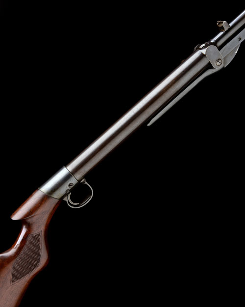 first year of production, 1919, with blued 19 1/4in. barrel, tall dove-tailed fore-sight stamped '.59', elevating notch rear-sight, plain blued air-chamber etched 'THE BSA STANDARD AIR-RIFLE .22 BORE (No2)' separated by a BSA 'piled arms' trademark above 'THE BIRMINGHAM SMALL ARMS CO LTD, SOLE MAKERS' above various international patents from 1906 to 1908 and registered design numbers (etching dark but legible), two-hole trigger-unit, chequered walnut half-pistol grip saw-back stock with grooved butt-end and blued push-button release under-lever, the whole retaining much original finish throughout
