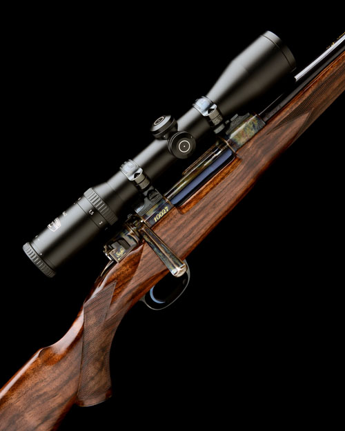 21 3/4in. unsighted nitro barrel, London proof marks for 1999, gold-inlaid in script 'E.J. CHURCHILL (GUNMAKERS) LONDON', colour-hardened receiver (with thumb cutout) with bold acanthus scroll engraving and gold-inlaid with the serial number, mounted with a Schmidt & Bender 1.5-6x42 telescopic sight, quickly-detachable mounts engraved with the calibre and serial number with scroll bordering, fully colour-hardened bolt, flat handle gold-inlaid with the serial number and with chequered oval, gold-inlaid 'SAFE' detail, blued hinged floorplate with push button release, finely engraved with feathered bordering and acanthus scrollwork surrounding a finely engraved central vignette of a roe buck, blued triggerguard gold-inlaid with the serial number, well-figured pistolgrip stock with cheekpiece, horn finial, sling eyes, engraved and colour-hardened steel pistolgrip-cap, 14 3/4in. pull including 3/4in. leather covered recoil pad