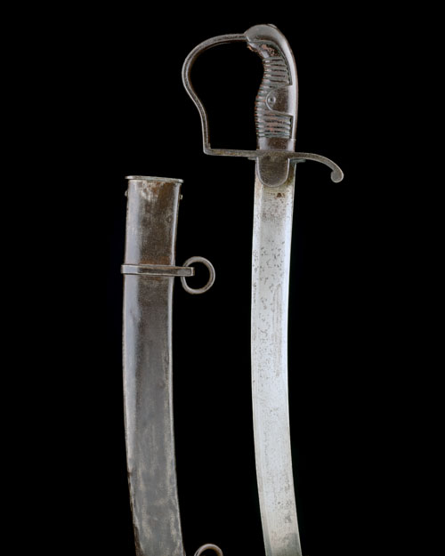 circa 1812, of typical form with strongly curved 32 1/2in. hatchet-tipped blade (some discolouration), iron stirrup hilt with turned down quillion, large langets, the left stamped '2.T.P.4.11.', plain iron back-strap and ribbed leather grip-piece (some pitting to hilt), TOGETHER WITH an associated iron scabbard, the neck marked as the hilt and also 'RAM 5.30' crossed out, complete with two loose suspension rings (mild surface pitting)