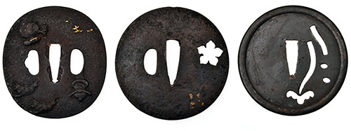 the earliest possibly Middle Muromachi period, of circular form with heavy rolled edge and pierced with a stylised pine-tree, the last two 18th century, with raised carved decoration with traces of gilded highlights and gold inlay work, one circular, the other of flat oval form, some corrosion to all three
