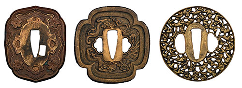 the first two 19th century, the first of heavy cross form with rounded lobes, one side deeply carved with flowers and vines, the other with dragons and lightning forks, the radiused edge also carved with further stylised vines, the second, circular and pierced with the '1000 monkeys' design, the last, later, possibly alloyed with copper and of military shin-gunto form, numbered '37' and with traces of gilding