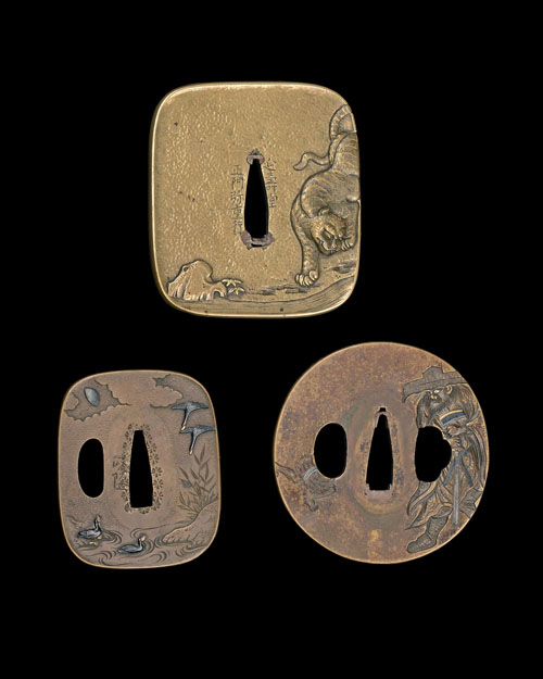 all probably 19th century, the first of square form with rounded corners, the front face featuring a prowling tiger carved in relief coming to drink at a flowing stream, the stripes on the body inlaid in gold, the body carved around the side of the tsuba with the hind quarters and tail appearing on the reverse together with a continuation of the stream and a waterfall, both sides signed along both sides of the 'nakago-ana', the second of circular form and deeply chisel engraved with swordsman stalking a demon, the demon escaping through the hole for the 'kozuka', its face appearing on the reverse together with clouds, the last for a wakizashi, of subtle truncated rectangular form with rounded corners, the front engraved with a pond inhabited by nielloed applied waterfowl with gilded beaks and feet and with further applied waterfowl flying amongst clouds above with an applied waxing moon, the whole on a stippled ground, the reverse with one similar waterfowl in flight above flowing water with gilded pebbles and engraved reeds along the shoreline, signed alongside the nakago-ana