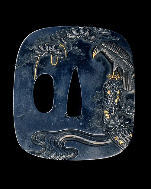late Edo period, the squared form with rounded corners and carved in relief with an eagle perched on the bough of a pine tree above a flowing stream, various details picked out in gold, the bough of the tree extending onto the reverse side with the stream continuing along the bottom, highly polished blue-black finish