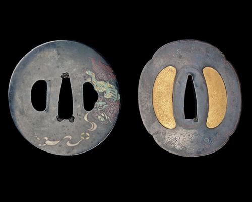 both 18th century and of shakudo, the first of circular form inlaid on both sides with abstract designs in poly-chromatic enamel, the second of lobed oval form, one side having an inlet enamelled 'Greek-key' design around the border, the opposite face with poly-chromatic vines and scrolls, the 'riobitsu' filled with yellow metal with a stippled surface
