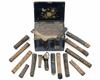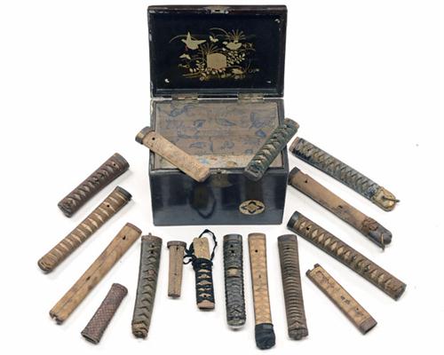 various ages, some with bindings and 'menuki', 'fuchi' and 'kashira' fittings, sixteen in total, as found, all contained within a laquered Japanese tea-caddy