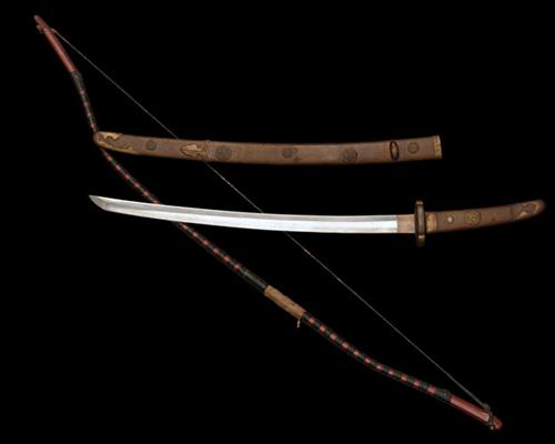 both circa 1900 and probably for the tourist market, the bow finished in red and black laquer, 24in. overall, strung, and with a leather bound grip, the sword with 12 1/2in. curved blade, visible temper-line, brass lobed tsuba, copper hilt with brass fittings and en-suite scabbard with applied brass Imperial 'mon' crests