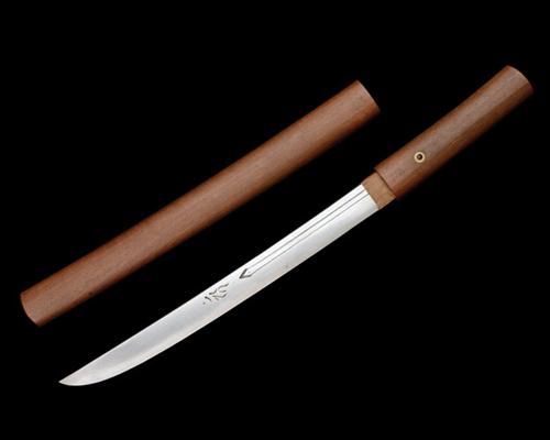 believed late 15th to early 16th century, with 14 1/4in. curved hatchet-point blade, carved 'horimono' to the left hand side of blade with twin narrow short fullers to the right, clearly visible 'hamon', signed tang with four re-mount holes (piercing signature) in a later hardwood 'shira-saya', fine condition throughout