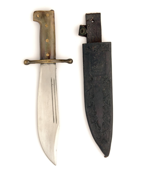 privately purchased by Col James Roosevelt for issue to the 2nd Raider Battalion U.S.M.C. in 1942, with 9 1/4in. clip-point blade signed 'COLLINS & CO LEGITIMUS MADE IN USA NO18' together with an arm and hammer trademark, twin lines carved near the back-edge to both sides, brass cross-guard with ball finials and horn grips held by five brass rivets, COMPLETE WITH its original tooled leather scabbard embossed with 'COLLINS & CO LEGITIMUS' together with a picture of an arm wielding a hammer above a crown and a large number '13' (leather retaining strap at fault)
